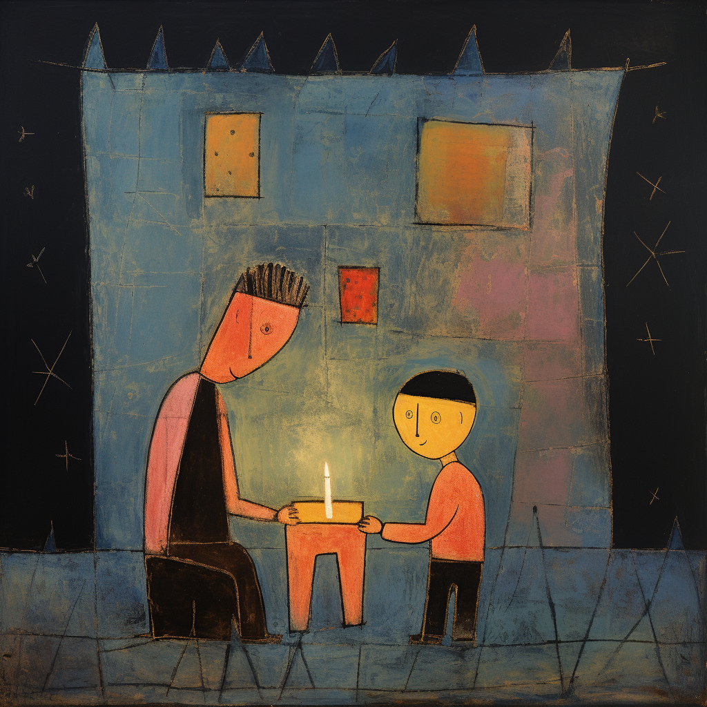 Une peinture moderne représente un enseignant et un élève dans le style abstrait et géométrique de Paul Klee.