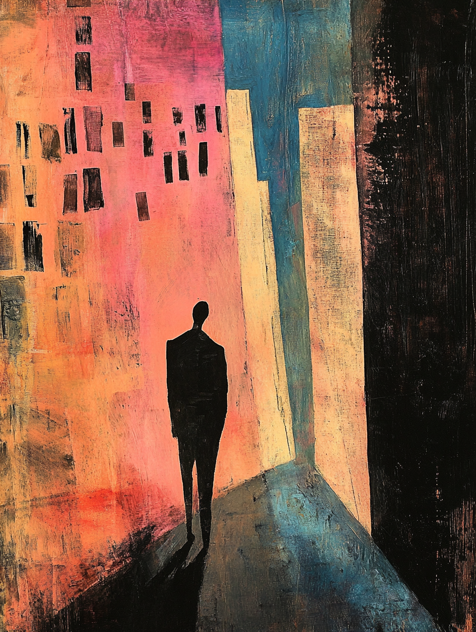 Une peinture moderne dépeint la silhouette ombragée d’un homme marchant dans les rues étroites d’une ville fantôme, rendue dans le style abstrait de Paul Klee.