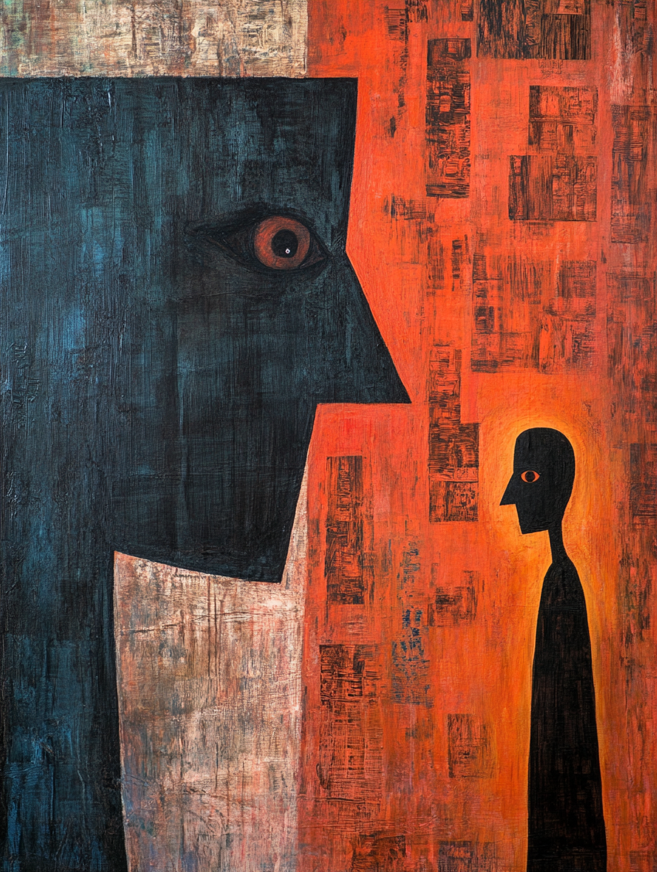 Une peinture moderne représente un grand visage dialoguant avec un visage plus petit, occupant tout l’espace de la toile.