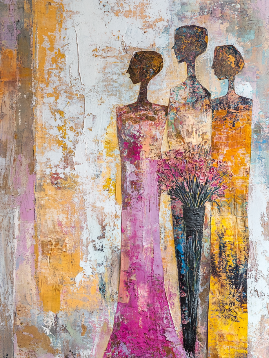 Une peinture colorée de style Paul Klee représente trois invités arrivant à une fête de village. Une femme tient des fleurs vibrantes, ajoutant de la grâce à la scène.