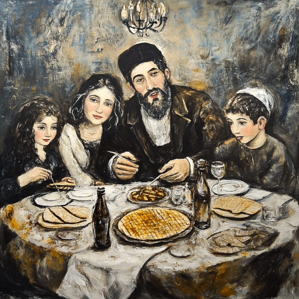 Une famille orthodoxe est assise autour de la table du Seder, dans une atmosphère à la fois chaleureuse et sérieuse. Ils se concentrent sur la signification de Pessah, chaque mot résonne profondément. Des signes de difficulté marquent leurs visages, mais la foi perdure, alliant tradition, résilience et espoir en un moment d’unité significative.