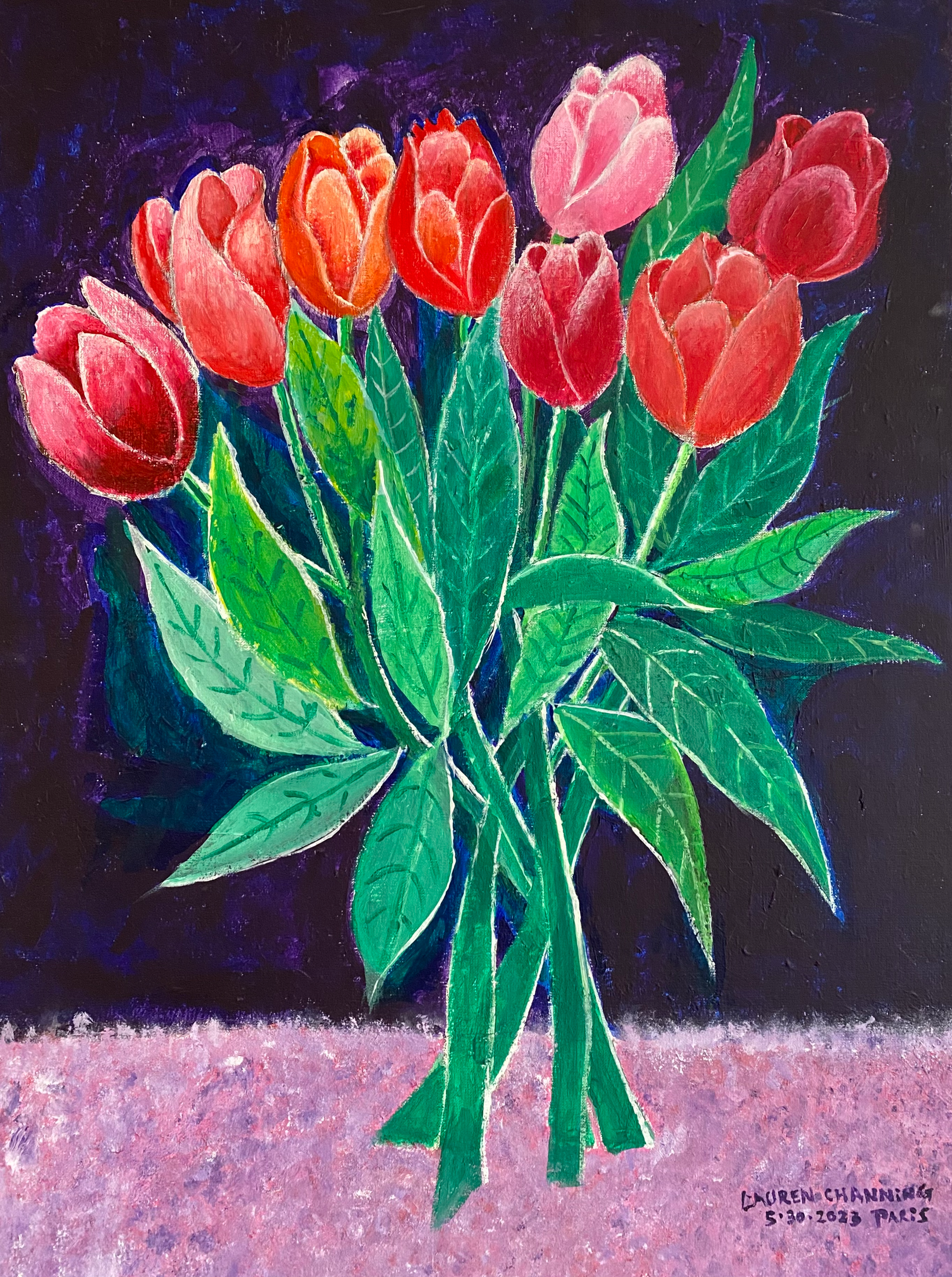 Les tulipes dégagent vitalité et tranquillité, symbolisant la diversité de la nature. Cette œuvre offre une interprétation moderne de l’art floral, célébrant l’harmonie des couleurs et des formes dans une composition sereine et joyeuse.